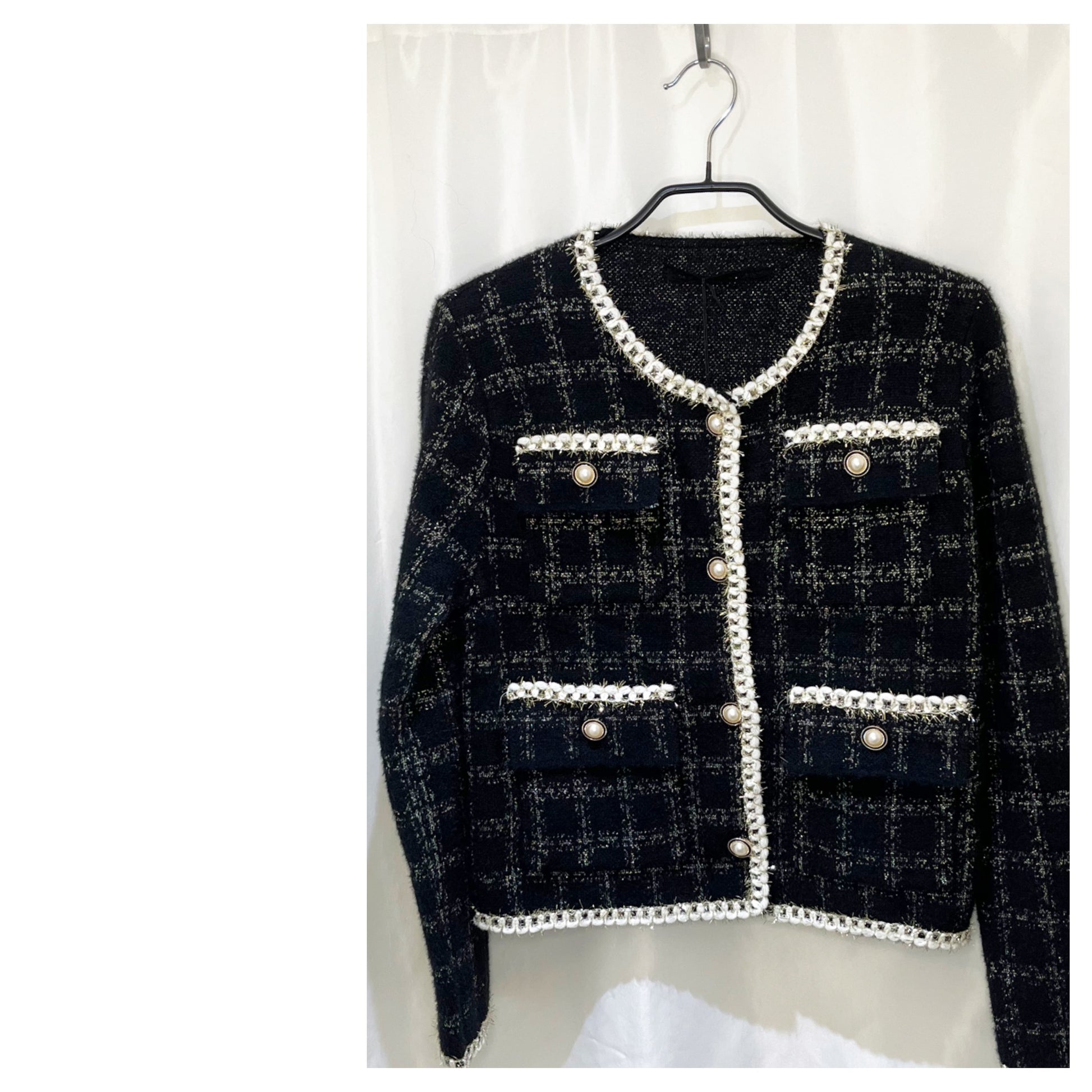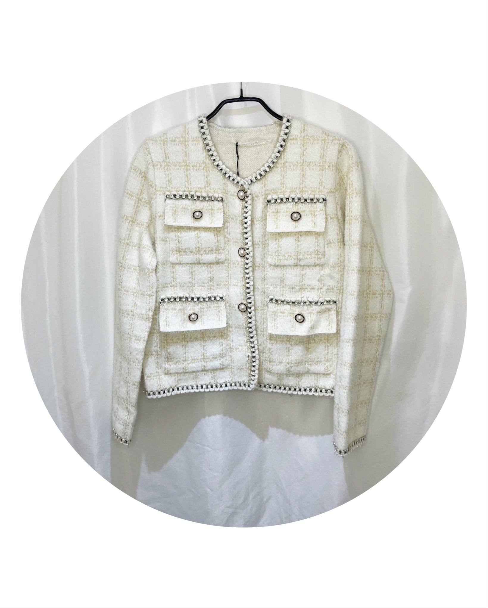 Adoptez un look chic et raffiné avec la Veste courte CoCo, conçu avec une impression fausse fourrure pour les femmes qui recherchent élégance Chic & confort pendant les mois plus froids! Cette veste , avec ses 4 poches latérales pratiques à rabats et son élégant bouton à chaque poche. La veste blazer impression quadrillée est décontractée pour les femmes. Elle est fabriquée en mélange qui donne un esprit tweed. Le tissage en tissu extensible aide à maintenir la coupe flatteuse et à créer une silhouette très ajustée & son liserer argent pour la veste noire et dorépour la veste blanc cassé . Blazer à boutonnage ouvert sur le devant, revers, manches longues, coupe ajustée, décontracté, motif à carreaux argent ou doré (voir photo).