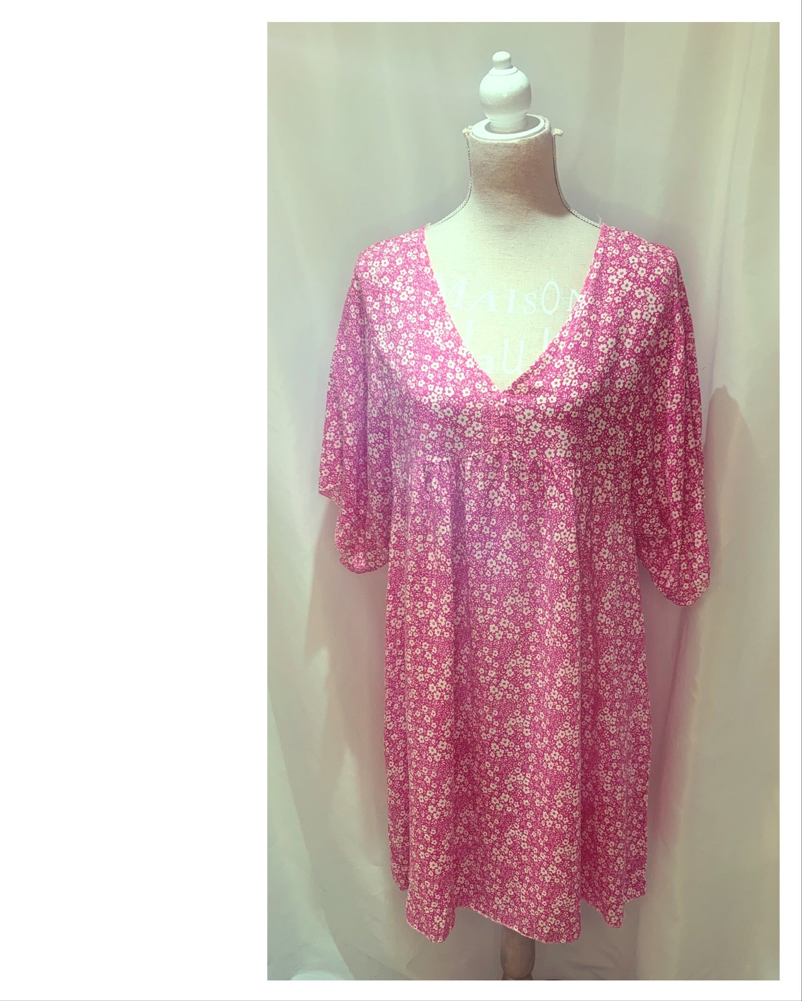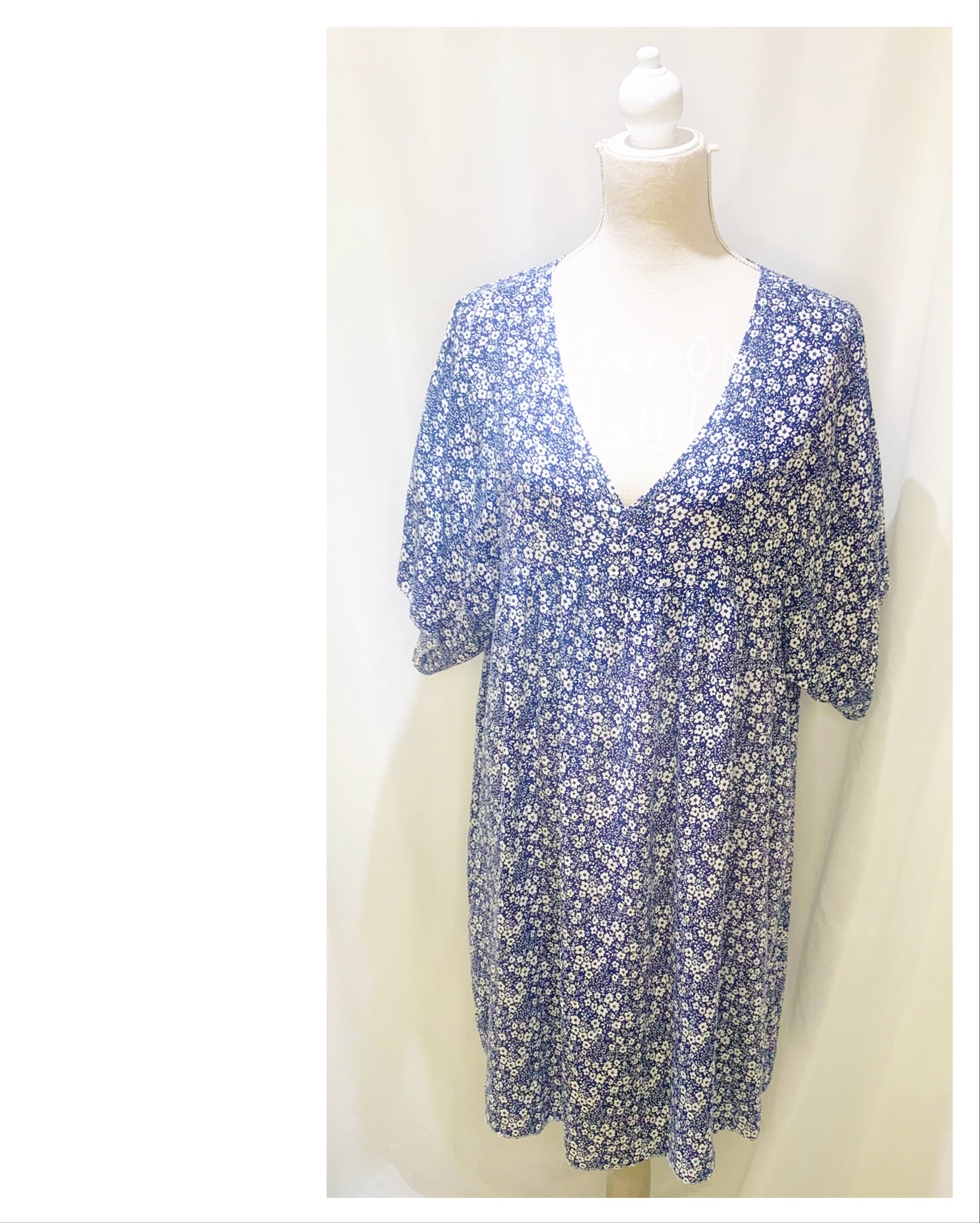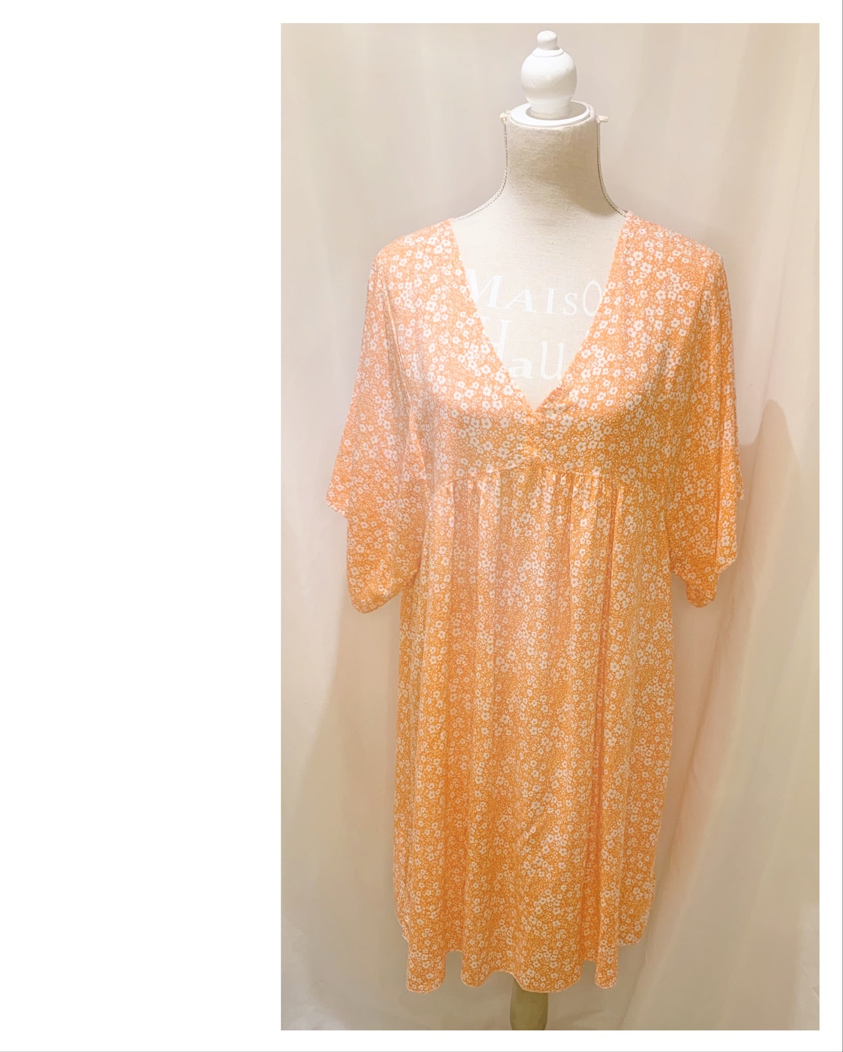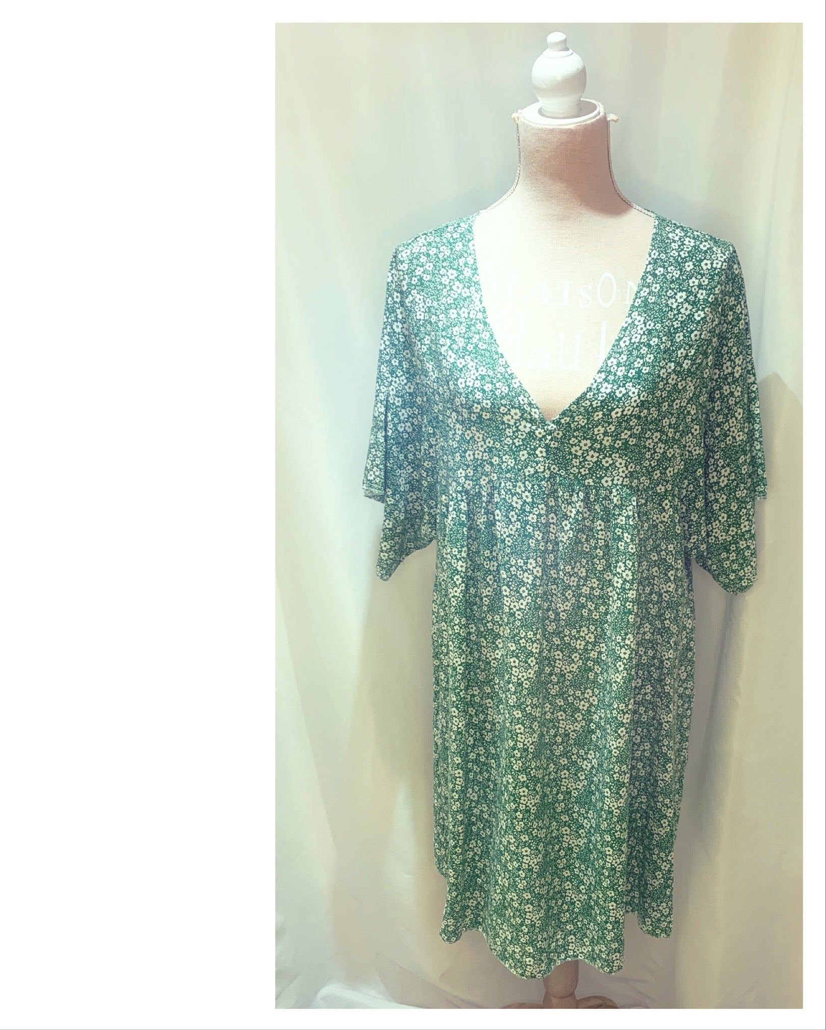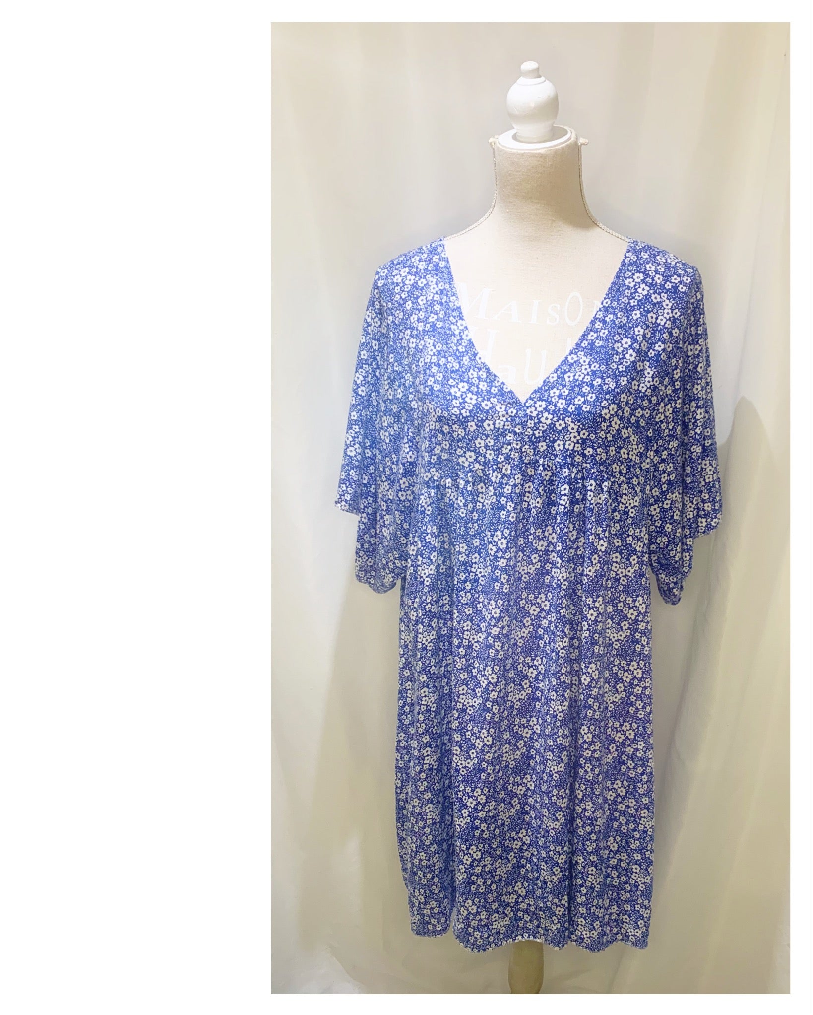 La robe modèle Russia imprimé petites fleurs bicolores forme trapèze longue à 87cm devant et 94 cm derrière ! Manches aux coudes forme large et sans volant. Elle présente un joli décolleté en V, convient à un usage quotidien décontracté ou stylé !