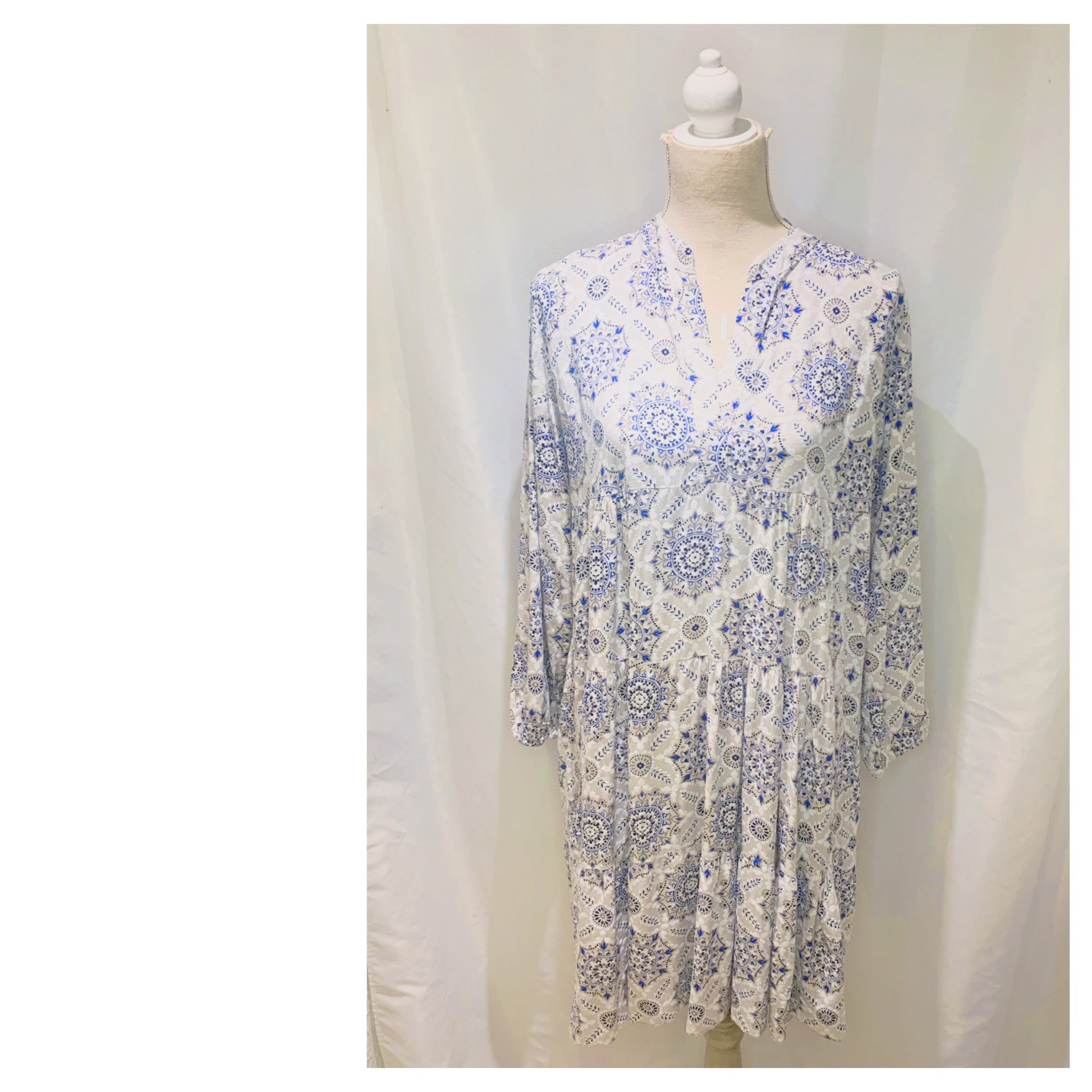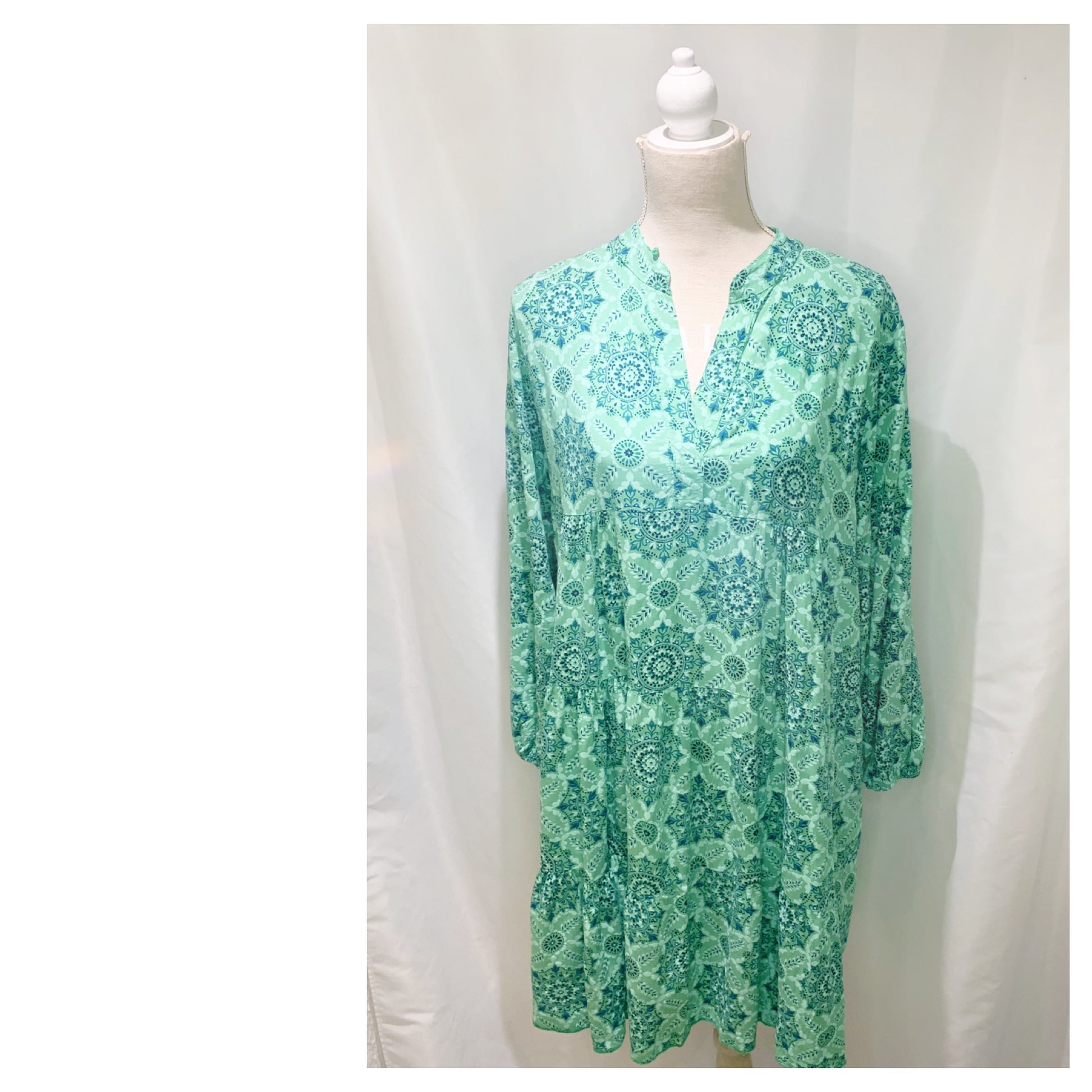 La robe  modèle Valérie imprimée original, trapèze longue à 100 cm !  Manches bouffantes et 3 volants, présente un col en V bouffant avec des liens et des manches bouffantes et convient à un usage quotidien décontracté ou stylé !